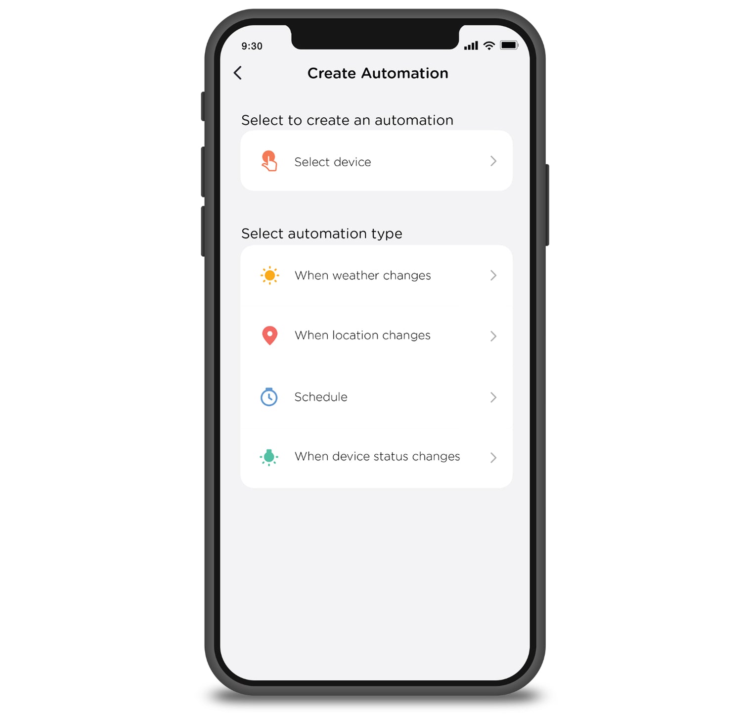 Create custom schedules and programs. Run automations based on location, weather conditions, sunrise/sunset times and more.