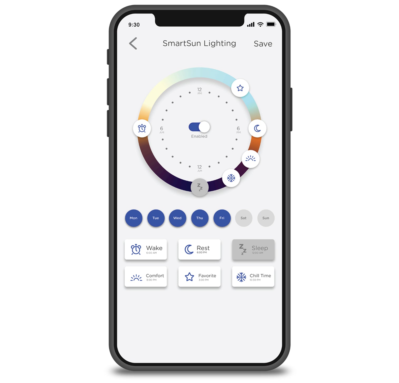 Programmable settings automatically adjust brightness and white temperature to support a proper circadian rhythm and create the perfect ambiance. The personalized cycle repeats every day.