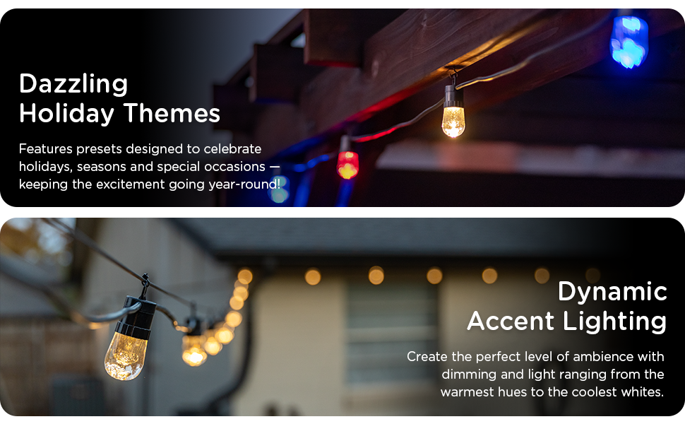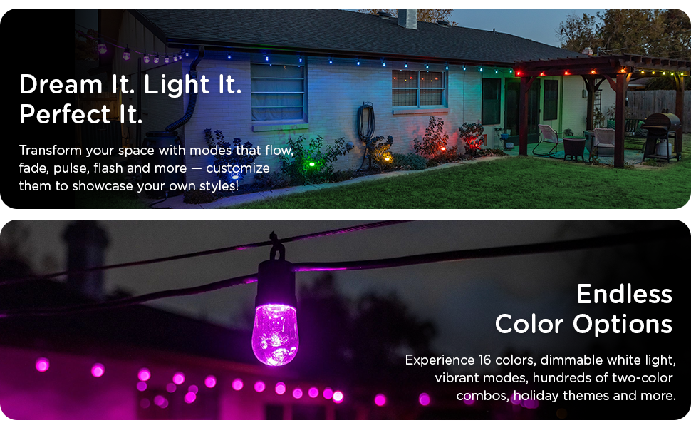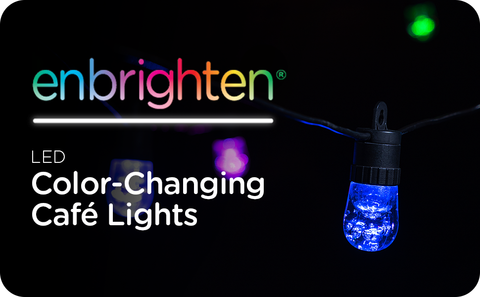 Lighting meets lifestyle with the Enbrighten Color-Changing LED Cafe Lights! Create the perfect outdoor or indoor lighting experience using the stunning Edison-style bulbs and single RF remote. Featuring a full suite of intuitive options, customize your space with 16 colors, vintage white light, dynamic modes, endless 2-color combinations, dimming and timers! Ideal for any vibe or occasion — celebrate your favorite team on game day, put on a light show for the holidays, cultivate a relaxing atmosphere and much more!