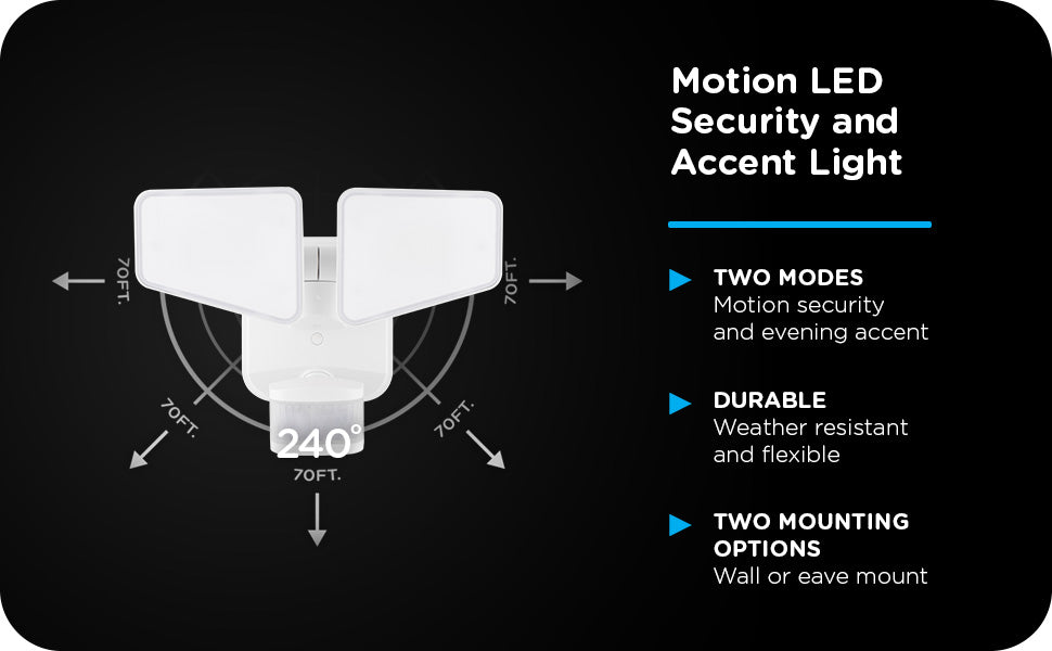 Keep your home shining bright with the Enbrighten Outdoor 2-Head Motion-Sensing LED Security Light, White. Use the motion-sensing light to monitor activity outside your home at night by illuminating your driveway, garage, backyard and more. With a motion-detection area of 240 ° at a distance of up to 70 feet, the light turns on as soon as it senses motion. Once motion is no longer detected, the light will automatically turn off after the preset amount of time you select. Your outdoor space will stay safely lit during your evening routines, and alert you if anyone is near your home after dark.