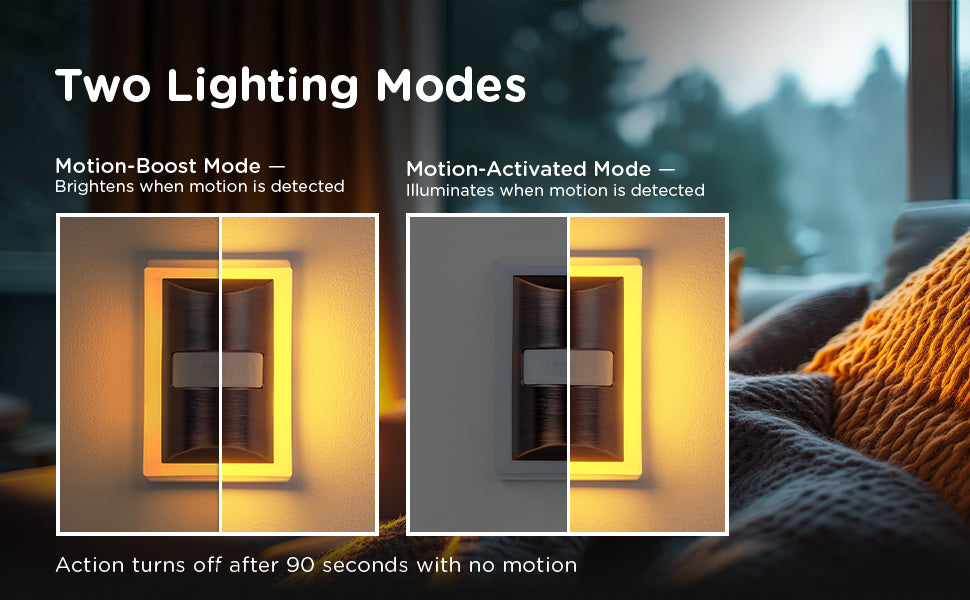 Settle in with the sleep-friendly glow of the Enbrighten LED SleepLight featuring Motion-Select technology. This warm night light for kids and adults emits a soft amber light that creates a calming ambiance for evening routines, minimizing disruptive blue light that can affect your internal clock. Eliminating blue light helps foster a relaxing atmosphere, making this dimmable night light ideal as wall décor, warm lighting for bedroom spaces, a soothing night light for baby nursery setups, stylish kids’ bathroom décor, or a comforting nightlight for kids’ room lighting. Motion-Select technology offers two lighting modes. Motion-boost mode combines dust-to-dawn automation with motion sensing. In low light, the wall light turns on as an amber guide light, brightens when motion is detected up to 20ft., then dims after 90 seconds of inactivity. Motion-activated mode illuminates only when motion is detected in low light within 20ft., then turns off after 90 seconds of inactivity. This sleek, white night light blends seamlessly into any room and covers both outlets. Whether used as a night light for kids, in hallways or in bathrooms, it’s a stylish and functional addition to your home. Ease into restful slumber with the Enbrighten LED SleepLite.
