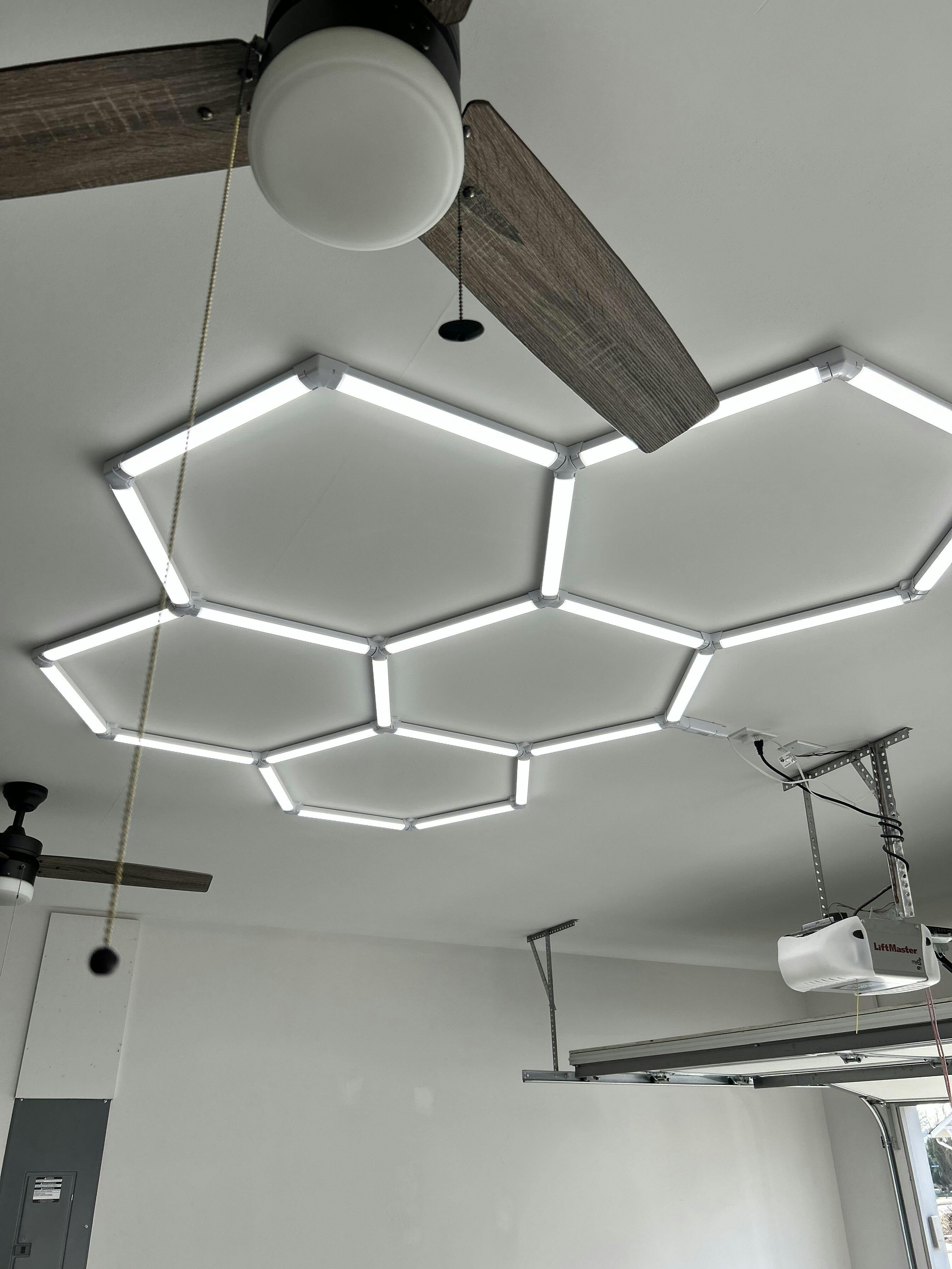 Enhance garages, workshops, gyms, home studios and more with up to 24,000 lumens — 1,000 lumens per bar — of 5000K bright white light. To adjust to any task or space, the kit features three brightness options. The lights are controlled by the included portable RF remote with wall mount or in-wall switch (not compatible with standard dimmers). Link up to 50 light bars (additional sets sold separately) to one power source to accommodate large spaces. Light your way with Enbrighten UltraBrite Hex Lights.
