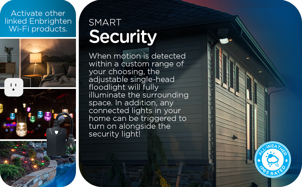 Experience the enhanced protection of smart security with the Enbrighten Outdoor Single-Head Motion-Sensing WiFi LED Security Light. Combining the premium standard in lighting technology and Wi-Fi controls, this security light is designed to help keep your home safe. With easy-to-use wireless features, the free Enbrighten app provides voice activation, variable motion sensing, on-demand ON/OFF control, dimming, custom scheduling and much more — available on the Apple App Store and Google Play, 2.4GHz Wi-Fi network required.