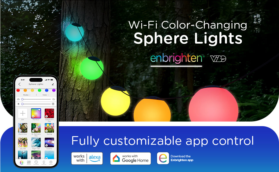 Illuminate your world with the Enbrighten VIBE LED Wi-Fi Sphere Lights. Perfect for lighting up outdoor patios, backyards and much more, choose vibrant colors for any setting, special occasion or season. They’re even great indoors. Integrate the string lights into your décor for a modern, stylish look in event spaces, ballrooms, wedding venues, offices and more. Featuring 6in. spheres that glow with a stunning array of colors and modes, these endlessly versatile lights are designed for year-round installation.