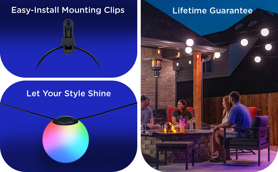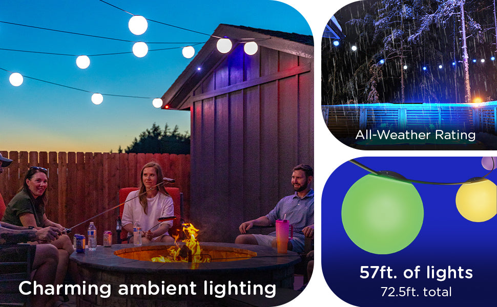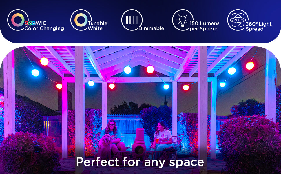 After pairing to your home’s 2.4GHz Wi-Fi network, the free Enbrighten app fully controls and customizes the look of your space. The user-friendly app is available in the Apple App Store or on Google Play. Use the impressive variety of features to choose lighting modes, colors, presets, dimming options, schedules and more. For even greater convenience, create personal modes with the app’s deep customization feature and opt for voice commands through Amazon Alexa and Google Assistant. This premium strand includes 12 globes with 5ft. spacing and has a total length of 72.5ft. Keep the night going with the Enbrighten VIBE LED Wi-Fi Sphere Lights.