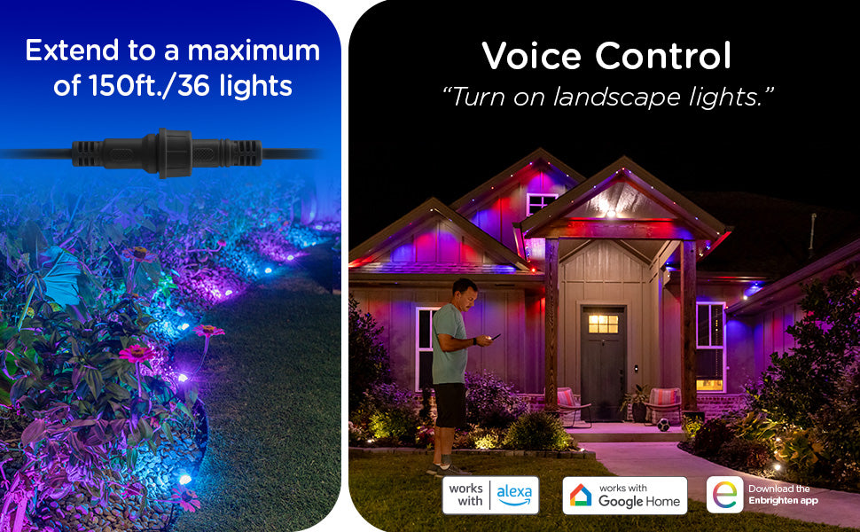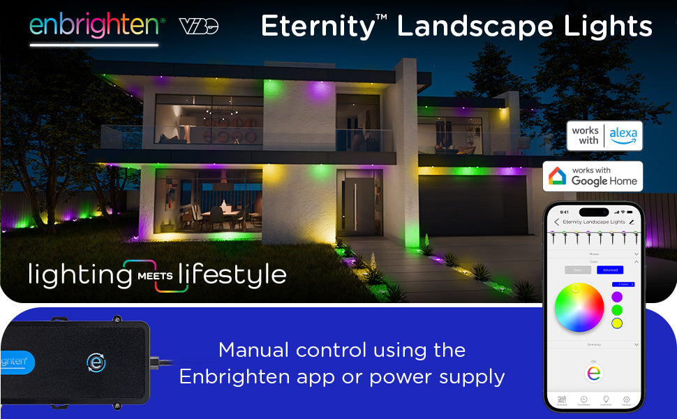 Enbrighten VIBE Eternity Landscape Lights are designed to transcend other permanent outdoor lights. They're built to make your home's lights an extension of your personality - lighting meets lifestyle. Each LED puck is expertly crafted using the highest quality RGBWIC LEDs, providing true-color illumination with full, rich colors. Perfect for every holiday, event or season, your dream lighting setup has endless color combinations, dynamic modes, customizable effects and more. Streamlined and simple, everything is controlled through the free Enbrighten app available in the Apple App Store and on Google Play.