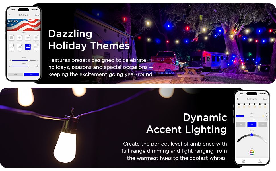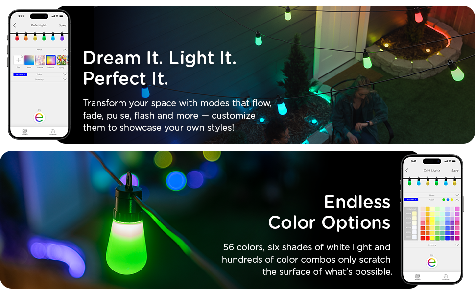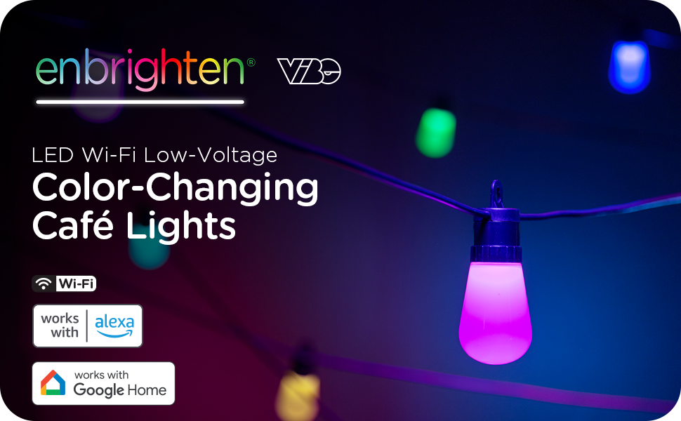 Experience the ease of smart lighting with the Enbrighten Smart LED Wi-Fi Color-Changing Cafe Lights! Powered by the Enbrighten app — available in the Apple App Store or Google Play — these 2.4GHz Wi-Fi compatible cafe lights let you enhance your space with a variety of colors, dynamic modes, scheduling and more. Voice controls are also available through Amazon Alexa and Google Home. Choose from 56 single colors, six shades of white, hundreds of custom combinations and seasonal holiday themes. These string lights are perfect year-round for landscapes, party lights, relaxing ambience, special occasions and much more.