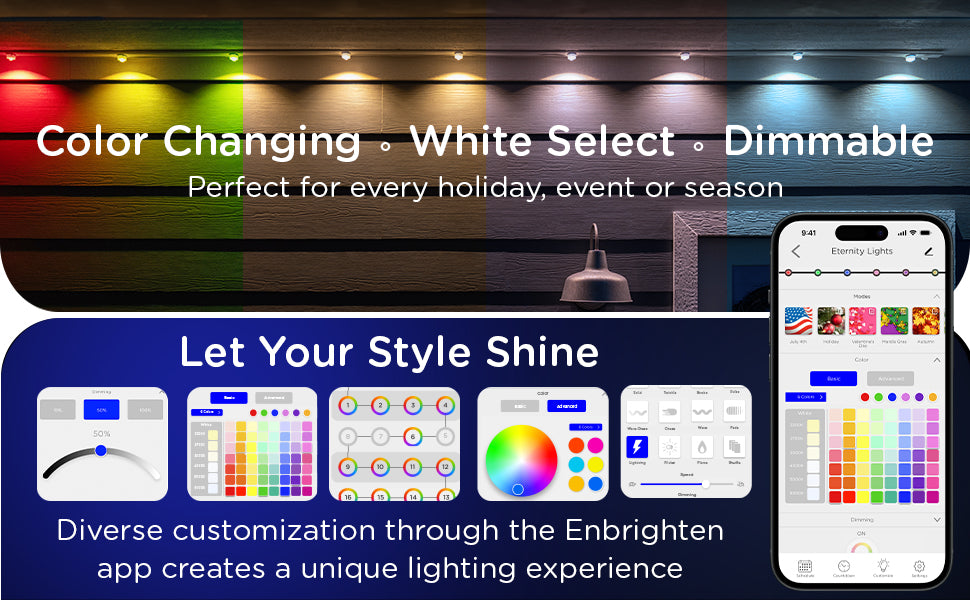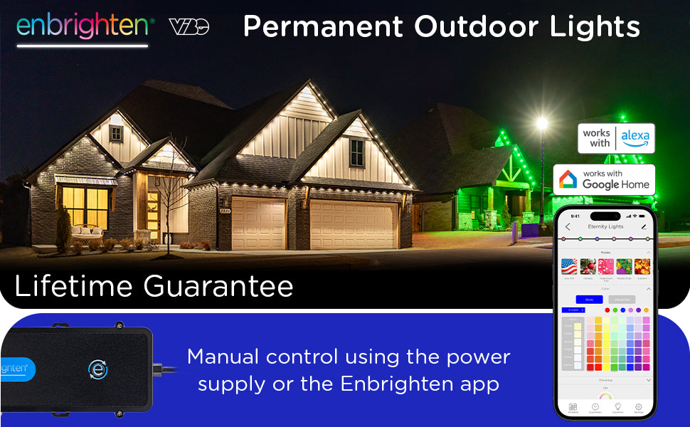 Enbrighten VIBE Eternity Lights are designed to transcend other permanent outdoor lights. They’re built to make your home’s lights an extension of your personality — lighting meets lifestyle. Each LED puck is expertly crafted using the highest quality RGBWIC LEDs, providing true-color illumination with full, rich colors. Perfect for every holiday, event or season, your dream lighting setup has endless color combinations, dynamic modes, customizable effects and more. Streamlined and simple, everything is controlled through the free Enbrighten app available in the Apple App Store and on Google Play.