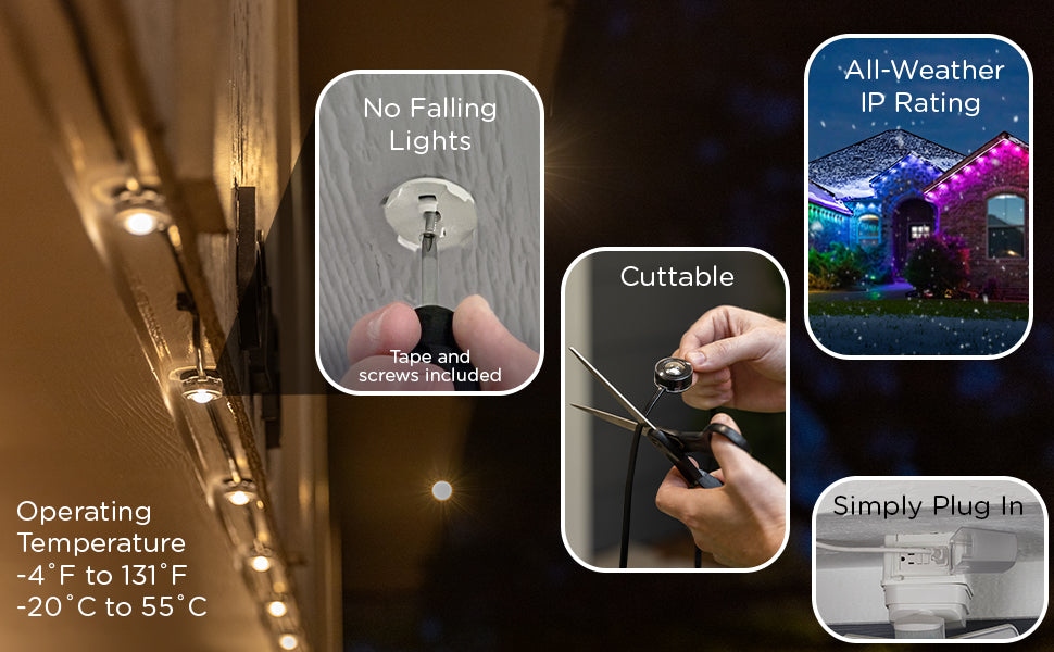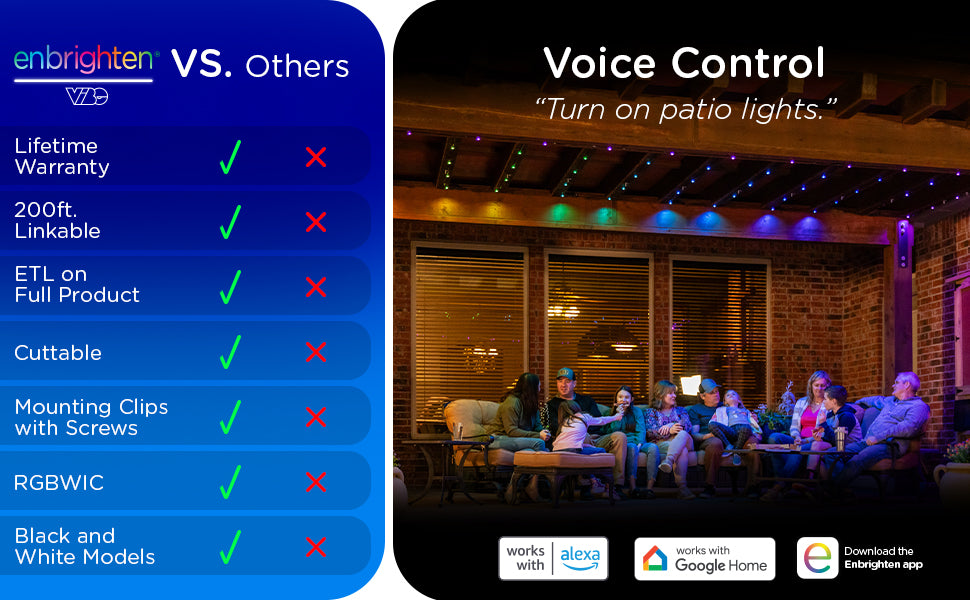 Eternity Lights are created to last a lifetime. Weatherproof and rated for the elements, they’ll only come down when you want them to. Using the patent-pending clips with included screws and premium 3M VHB tape, the strands are easily installed as eave lights, holiday lights, pergola lights, balcony lights and more. The subtle LED pucks are virtually invisible when installed and envelope your space in a cascade of color when on. For added flexibility, connect multiple strands or extensions up to 150ft. (200ft. for less output). You can even cut the end of the strand to fine-tune your setup. For your lifestyle, for forever — Enbrighten VIBE Eternity Lights.
