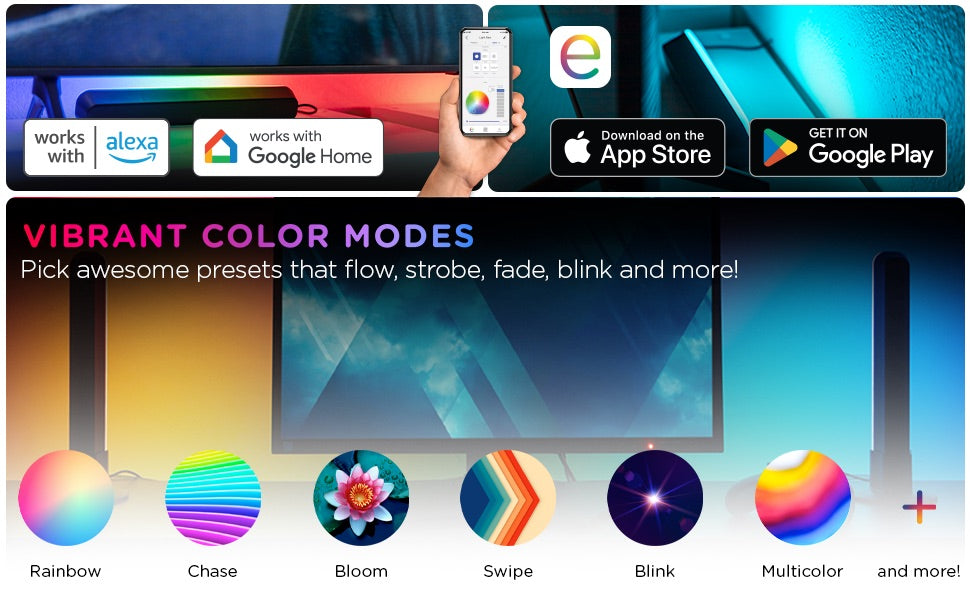 The Enbrighten Smart Gaming Light Bars transform your space with vibrant, reactive accent lighting. Each of the two sleek LED bars can stand upright or lay horizontally — perfect for TV backlights, gaming setups, shelves, party lights and much more! Everything is controlled using the free Enbrighten app, available on the Apple App Store and on Google Play (2.4GHz Wi-Fi required to pair). In addition to voice control compatibility through Amazon Alexa and Google Home, you can also manage other features like schedules and countdowns.