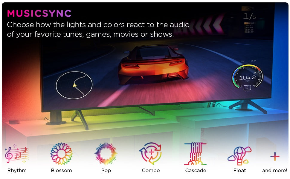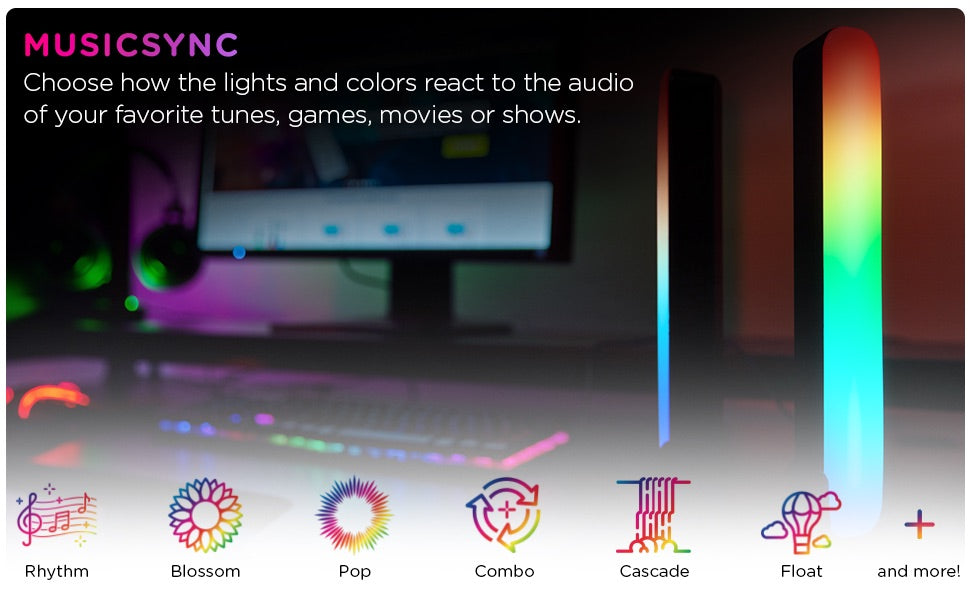 Inside the app, there are awesome modes that flow, strobe, fade, blink and more — something for every vibe or occasion. In addition to the wide variety of presets, the dynamic MusicSync setting lets you choose how the lights react in real time to the audio of your favorite tunes, games or movies! The LED bars share a 5ft. USB-A power cable — ideal for plugging directly into TVs or computers or game consoles (5V, 2A adapter not included). With intuitive app controls and phenomenal color modes, change the way you light your space with the Enbrighten Smart Gaming Light Bars!
